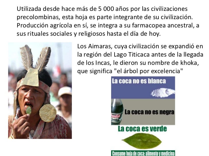 - 11. Utilizada desde hace más de 5 000 años por las civilizacionesprecolombinas, esta hoja es parte integrante de su civilización.Producción agrícola en sí, se integra a su farmacopea ancestral, asus rituales sociales y religiosos hasta el día de hoy. Los Aimaras, cuya civilización se expandió en la región del Lago Titicaca antes de la llegada de los Incas, le dieron su nombre de khoka, que significa "el árbol por excelencia"