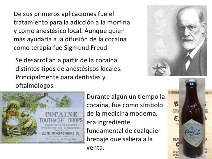 - 14. De sus primeros aplicaciones fue eltratamiento para la adicción a la morfinay como anestésico local. Aunque quienmás ayudaría a la difusión de la cocaínacomo terapia fue Sigmund Freud.Se desarrollan a partir de la cocaínadistintos tipos de anestésicos locales.Principalmente para dentistas yoftalmólogos. Durante algún un tiempo la cocaína, fue como símbolo de la medicina moderna, era ingrediente fundamental de cualquier brebaje que saliera a la venta.