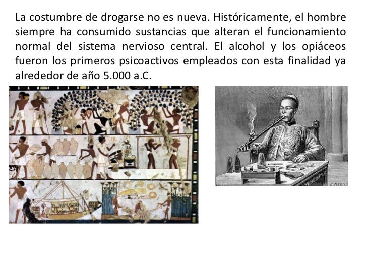 - 2. La costumbre de drogarse no es nueva. Históricamente, el hombresiempre ha consumido sustancias que alteran el funcionamientonormal del sistema nervioso central. El alcohol y los opiáceosfueron los primeros psicoactivos empleados con esta finalidad yaalrededor de año 5.000 a.C.