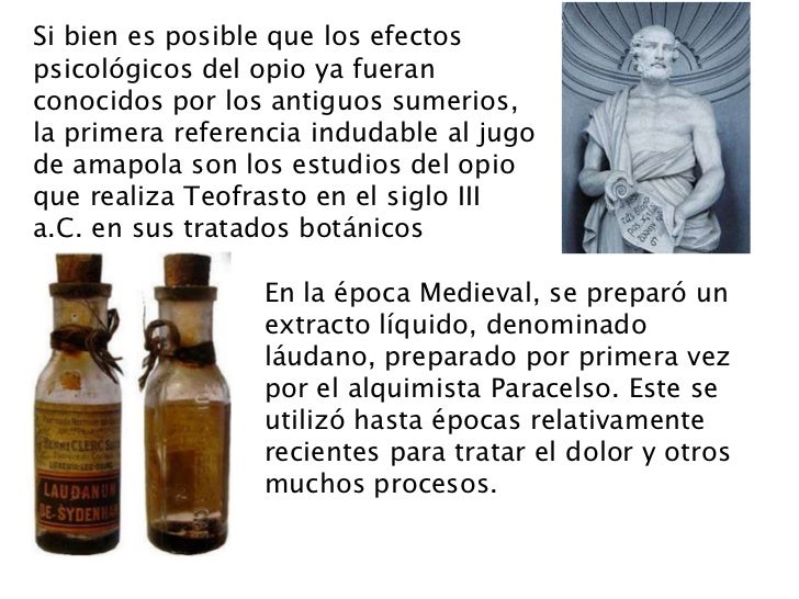 - 4. Si bien es posible que los efectospsicológicos del opio ya fueranconocidos por los antiguos sumerios,la primera referencia indudable al jugode amapola son los estudios del opioque realiza Teofrasto en el siglo IIIa.C. en sus tratados botánicos En la época Medieval, se preparó un extracto líquido, denominado láudano, preparado por primera vez por el alquimista Paracelso. Este se utilizó hasta épocas relativamente recientes para tratar el dolor y otros muchos procesos.