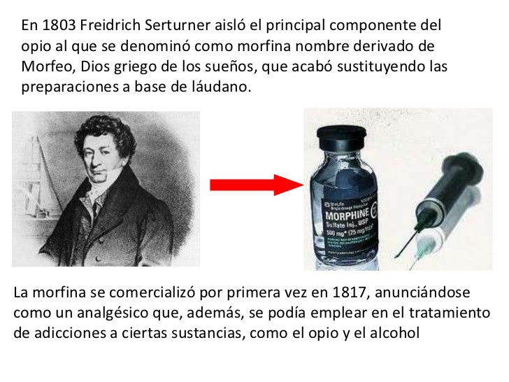 - 5. En 1803 Freidrich Serturner aisló el principal componente del opio al que se denominó como morfina nombre derivado de Morfeo, Dios griego de los sueños, que acabó sustituyendo las preparaciones a base de láudano.La morfina se comercializó por primera vez en 1817, anunciándosecomo un analgésico que, además, se podía emplear en el tratamientode adicciones a ciertas sustancias, como el opio y el alcohol