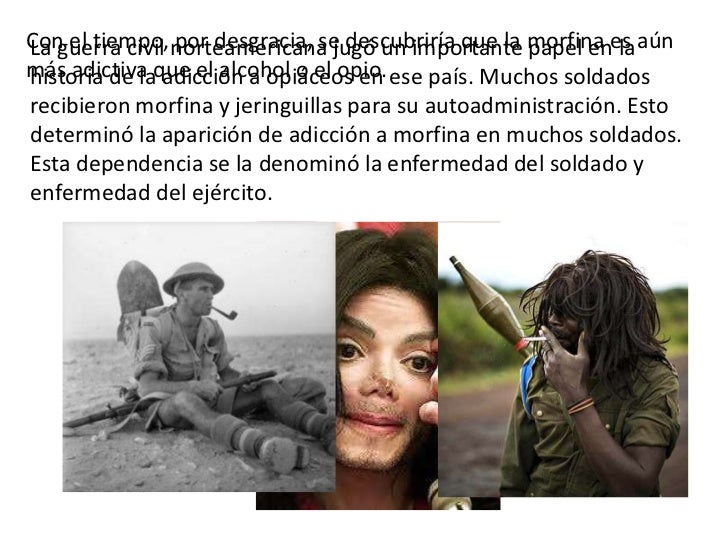 - 6. Con el tiempo, norteamericana jugó un importante morfina es aúnLa guerra civil por desgracia, se descubriría que la papel en lamás adictiva que el alcohol o el opio. ese país. Muchos soldadoshistoria de la adicción a opiáceos enrecibieron morfina y jeringuillas para su autoadministración. Estodeterminó la aparición de adicción a morfina en muchos soldados.Esta dependencia se la denominó la enfermedad del soldado yenfermedad del ejército.