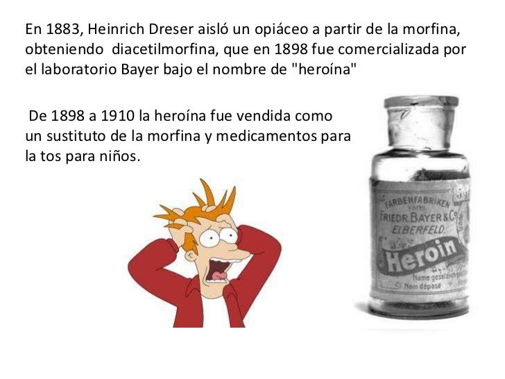 - 7. En 1883, Heinrich Dreser aisló un opiáceo a partir de la morfina,obteniendo diacetilmorfina, que en 1898 fue comercializada porel laboratorio Bayer bajo el nombre de "heroína" De 1898 a 1910 la heroína fue vendida comoun sustituto de la morfina y medicamentos parala tos para niños.